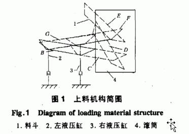 拋丸機裝料機構(gòu)由以下部分組成:左右上料油缸、料斗架、料斗及連桿機構(gòu),簡化的運動簡圖如圖I所示。該機構(gòu)的工作原理:在裝料初始時,左右液壓缸以相同速度同時工作,待料斗到達位置口時,右液壓缸下降,致使料斗至位置c,然后右液壓缸上升,同時左液壓缸下降,使料斗以D—E一,一c— 順序進行工作,最后回到位置B ,由左右液壓缸同時下降回到原位,整個工作過程完成。