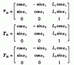 在機座建立坐標(biāo)系蜀x0y0 z0,在動臂上建立動態(tài)坐標(biāo)系 x1yl z1在斗桿上建立動態(tài)坐標(biāo)系X2y2 z2,在鏟斗上建立動態(tài)坐標(biāo)系 x3y3z3;z1z2z3。 軸通過各回轉(zhuǎn)副的軸線,方向符合右手定則,則各機構(gòu)的旋轉(zhuǎn)矩陣為