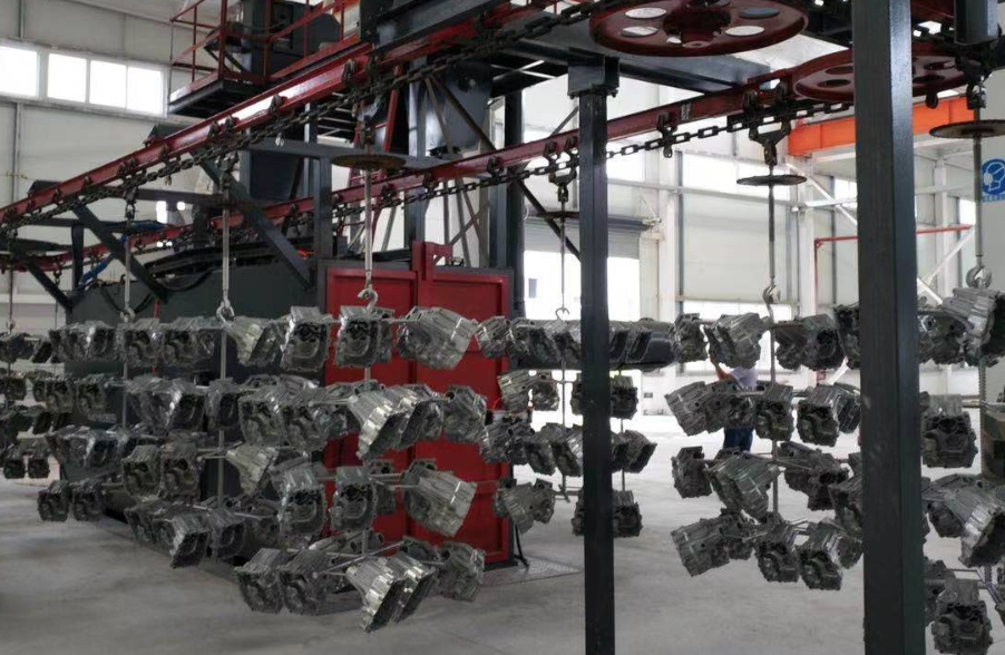 其工作原理是工件隨吊鏈可連續(xù)運行、步進運行或采用先進的積放推式懸鏈輸送工件,使工件在裝卸料以及拋丸區(qū)分別處于停止狀態(tài),實現(xiàn)定點裝卸和定點拋丸工序,根據(jù)工件不同可單點吊重50~2000kg,且生產(chǎn)率高,運行可靠,對各類易吊掛類零件的大批量清理,非常適用。
