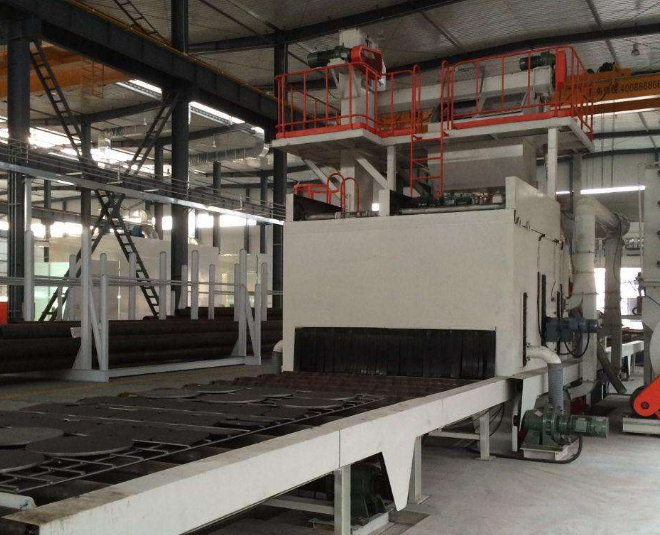 輥道承載工件經(jīng)輸入輥道運(yùn)至拋丸清理室,多臺拋丸器運(yùn)轉(zhuǎn)加速彈丸轟擊工件表面,有效地去除工件表面銹蝕、氧化皮、焊渣,獲得一定粗糙度及表面壓應(yīng)力的金屬本色表面,以提高涂漆附著力并延長鋼結(jié)構(gòu)件的使用壽命,達(dá)到拋丸清理的目的。